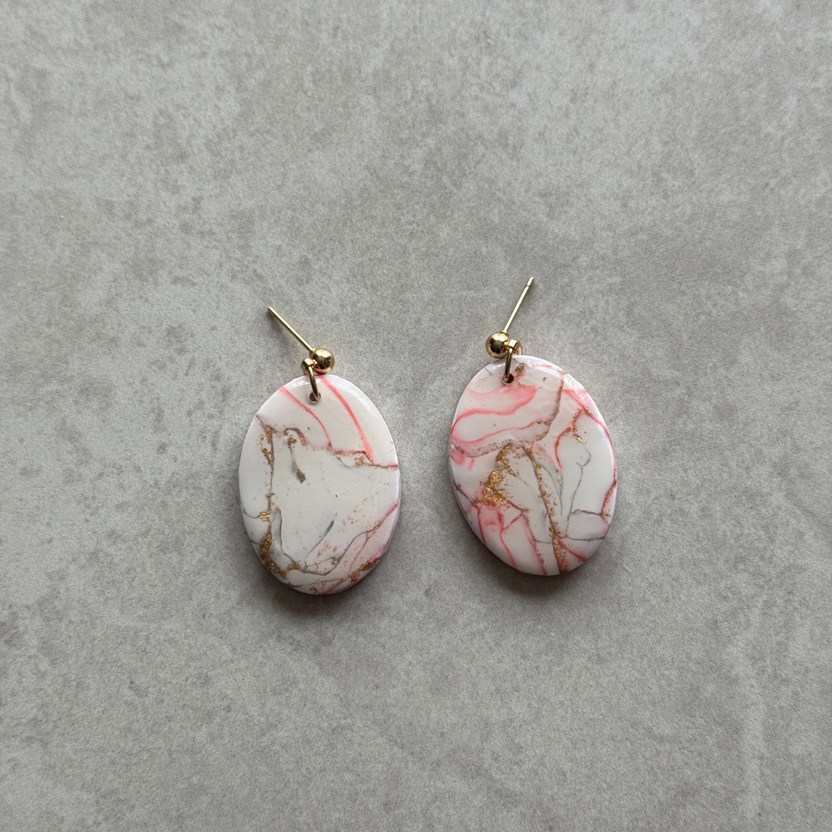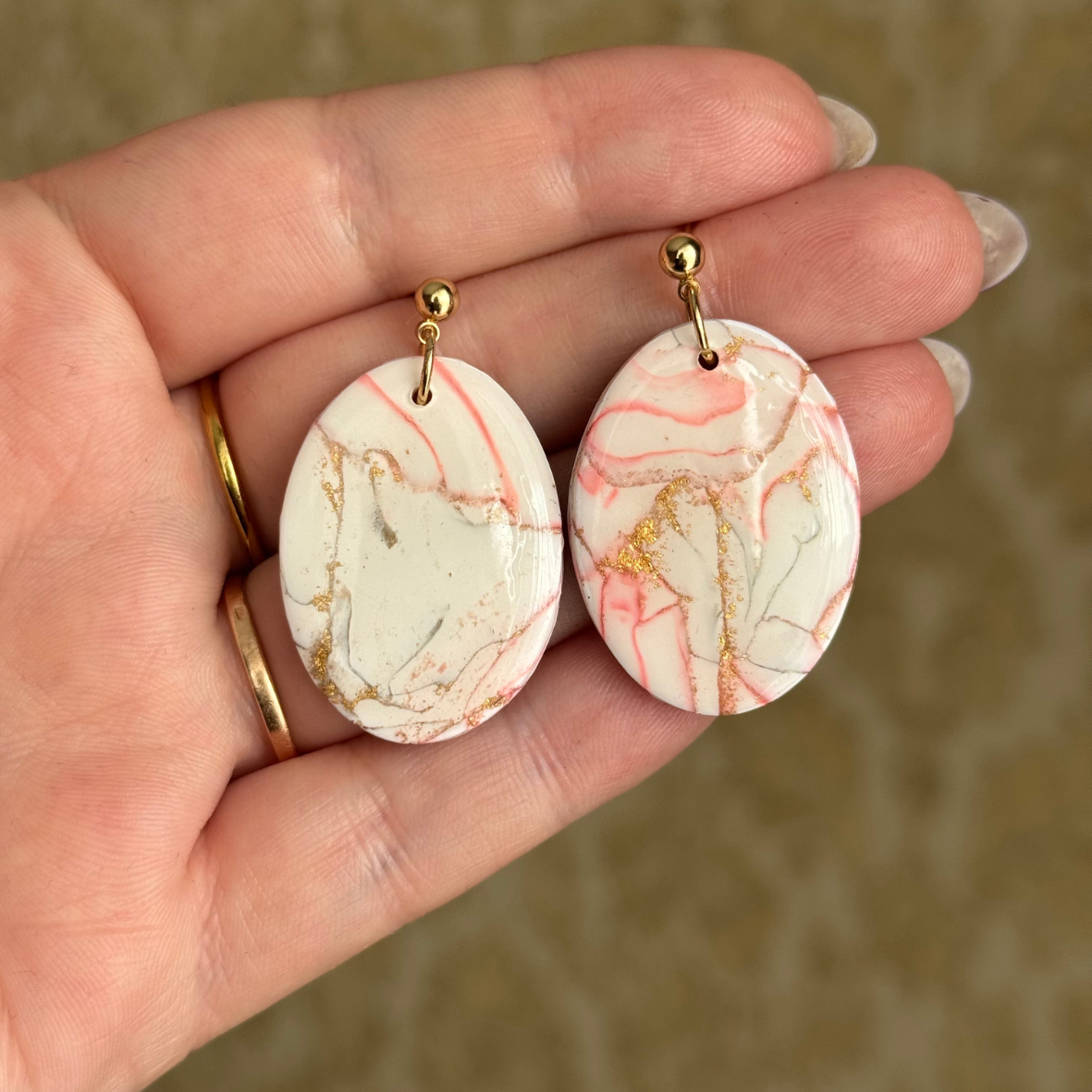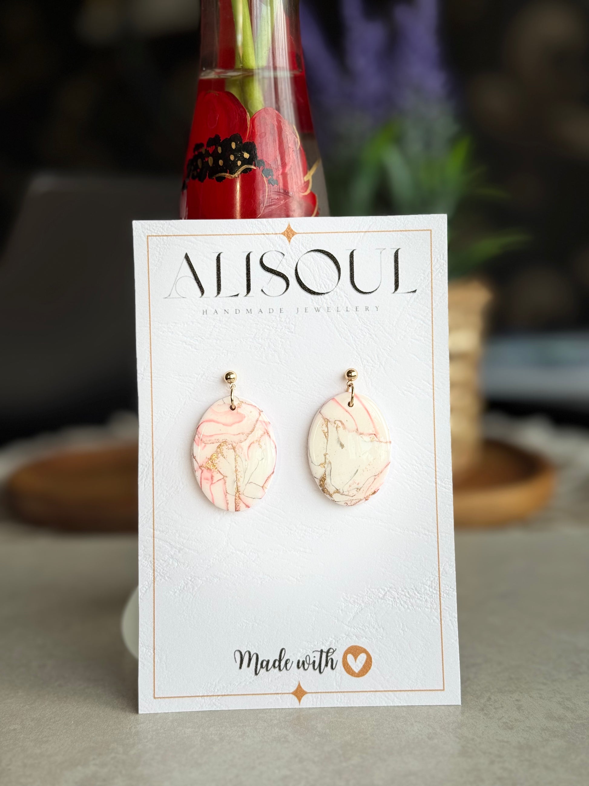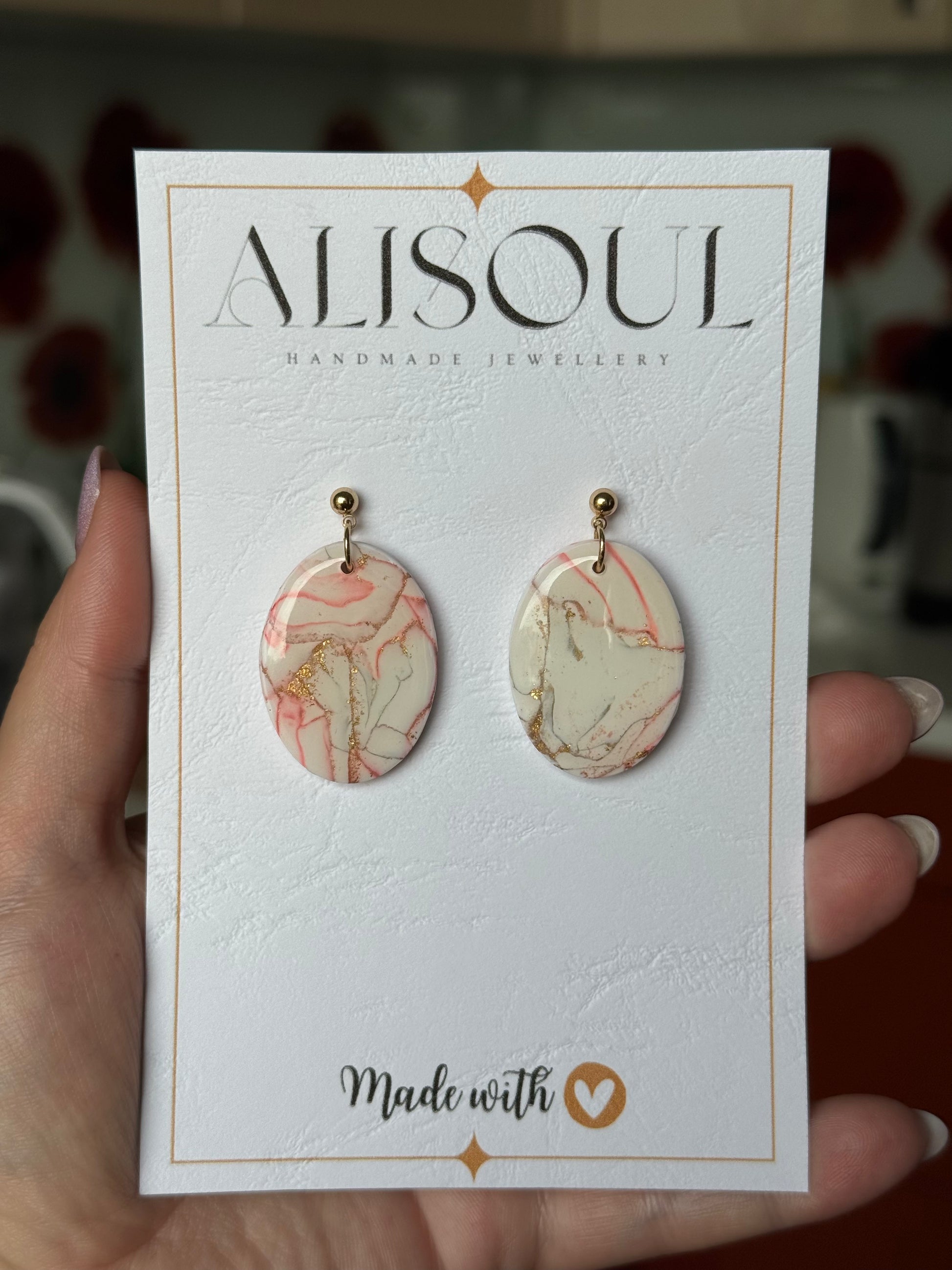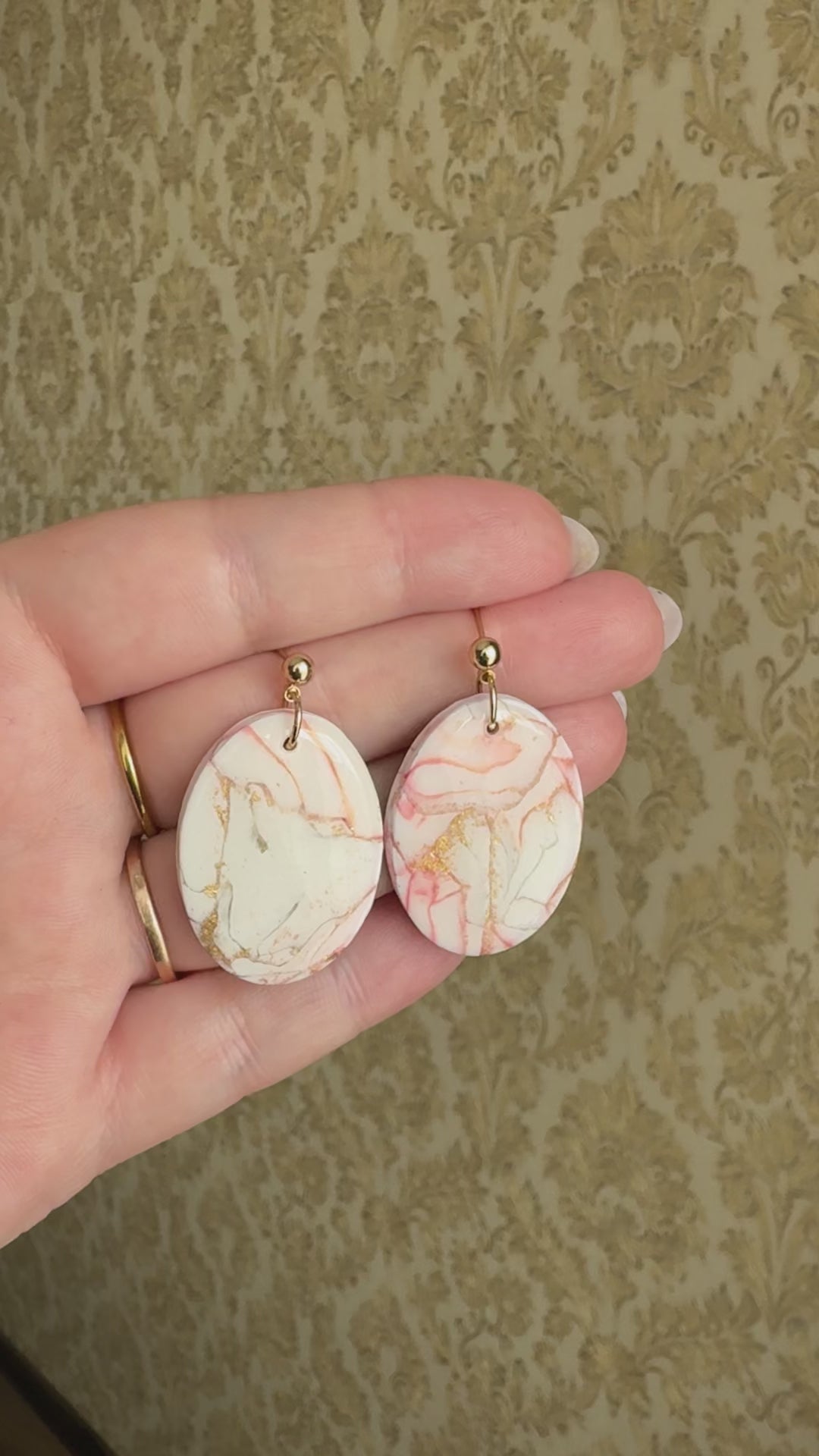 Šie auskari ir roku darbs, izmantojot polimērmālu un 18 karātu apzeltītu ķirurģiskā nerūsējošā tērauda lodīšu furnitūru. Tie ir jautri un būs spilgts papildinājums jūsu tērpam. Ļoti viegli un ērti valkājami. Furnitūra ir pārklāta ar 18 karātu apzeltījumu, hipoalerģiska, nesatur niķeli un svinu.