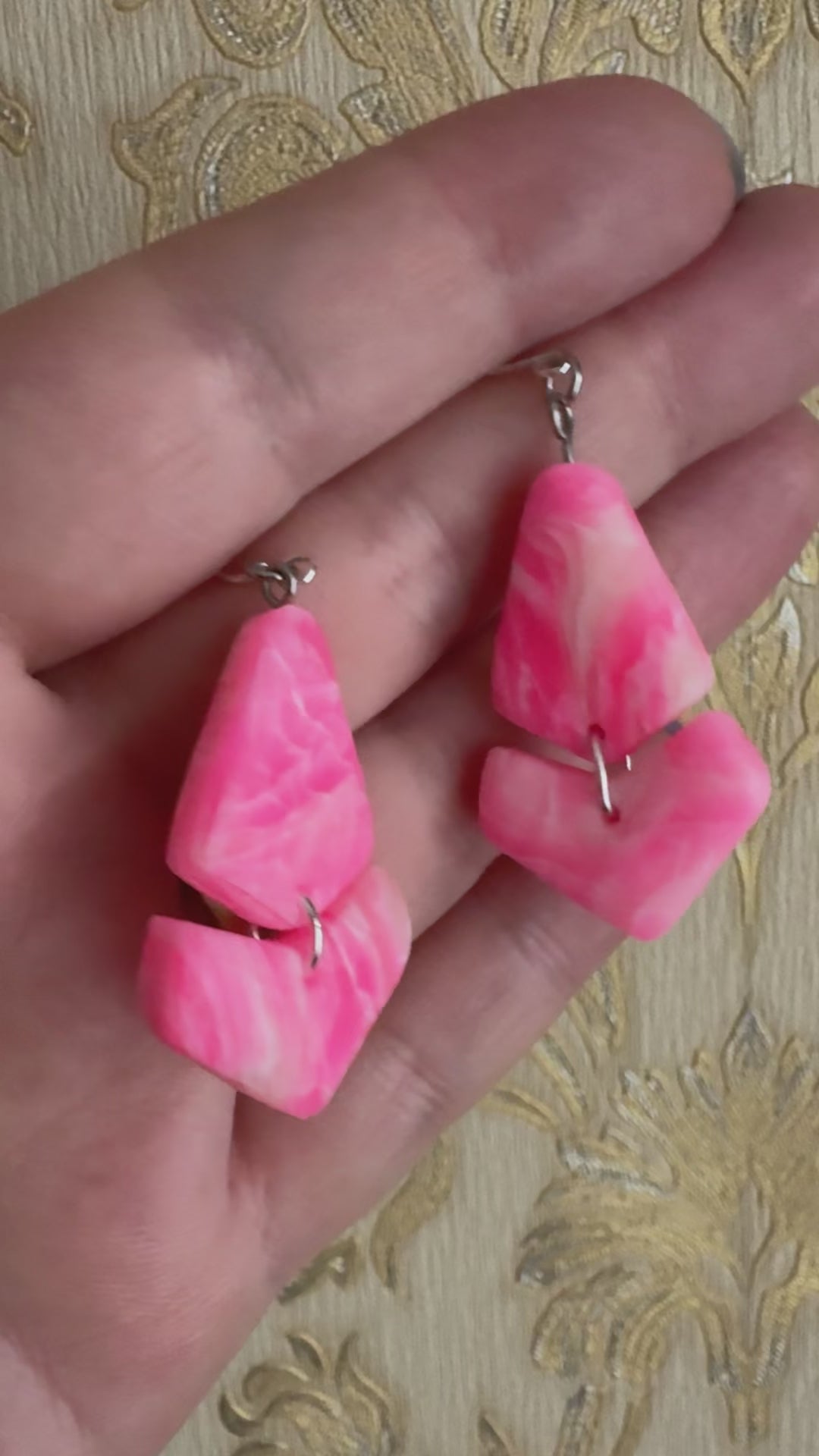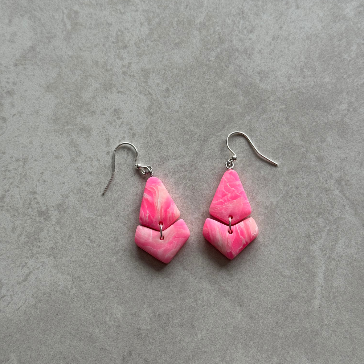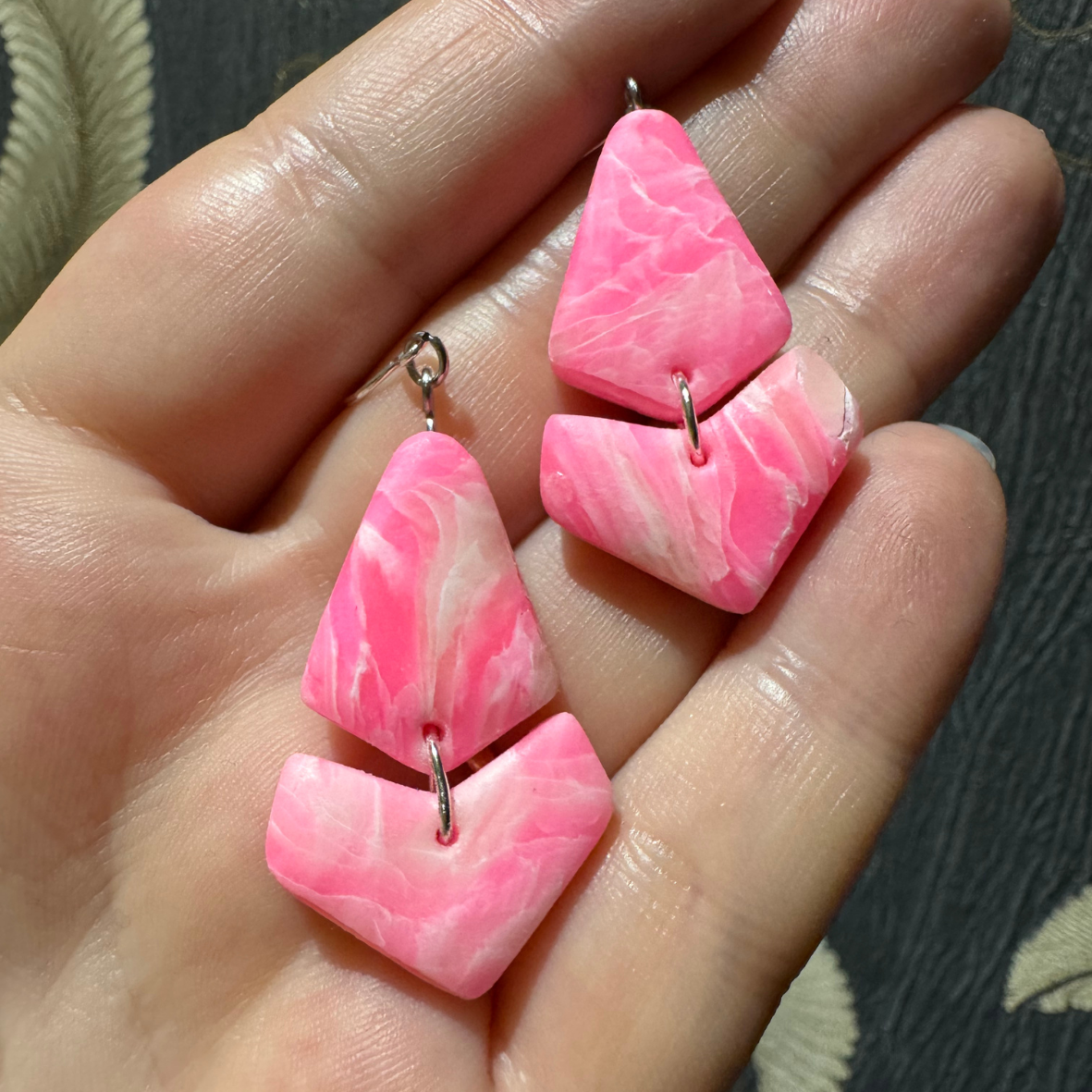 Šie auskari ir roku darbs, izmantojot polimērmālu un sudrabotus āķus. Tie ir jautri un būs spilgts papildinājums jūsu tērpam. Ļoti viegli un ērti valkājami. Auskari ir hipoalerģiski, bez niķeļa un svina.